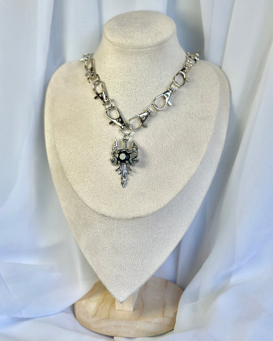 Silver Gothic Metal Clasp Choker Necklace - Swords & Cross