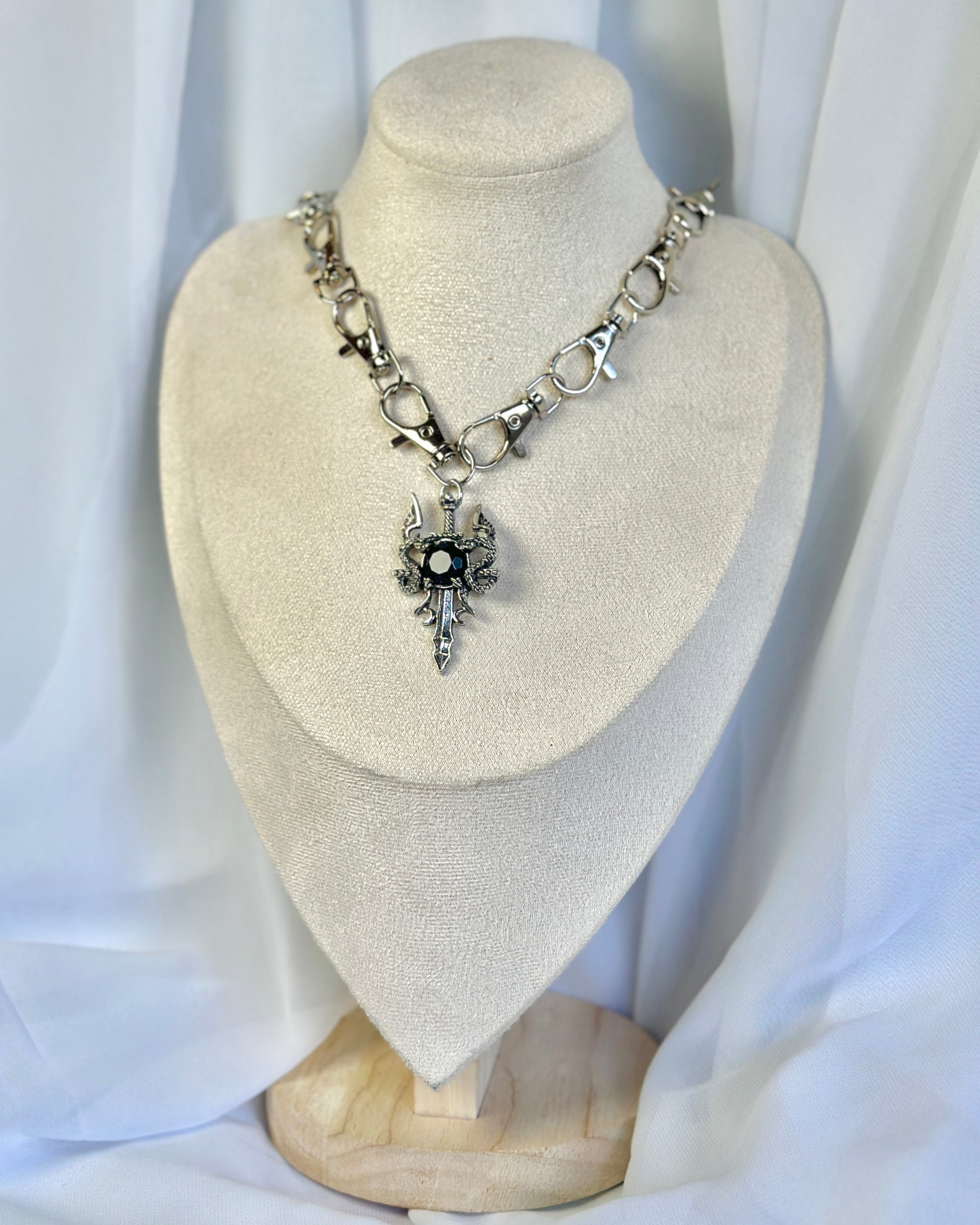 Handcrafted with interlocking metal clasps, this design features a dragon sword charm, perfect for goth, punk, and alternative fashion lovers.