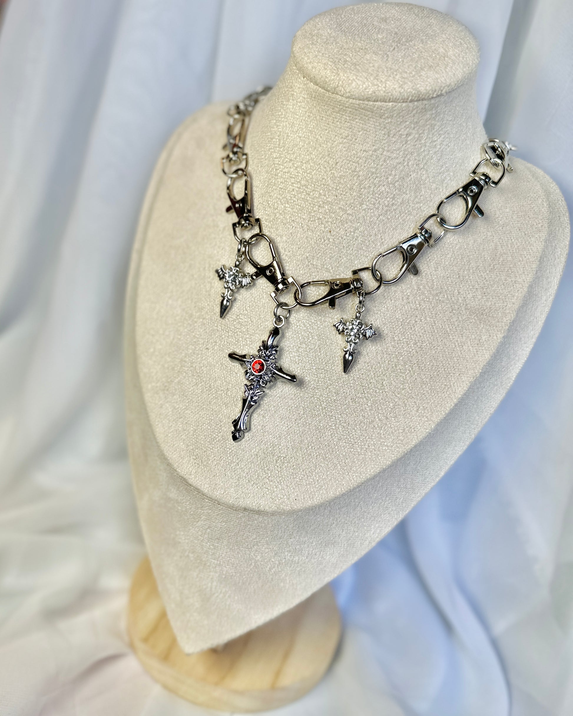 Handcrafted with interlocking metal clasps, this design features a large cross charm in the centre, and two swords either side, perfect for goth, punk, and alternative fashion lovers.